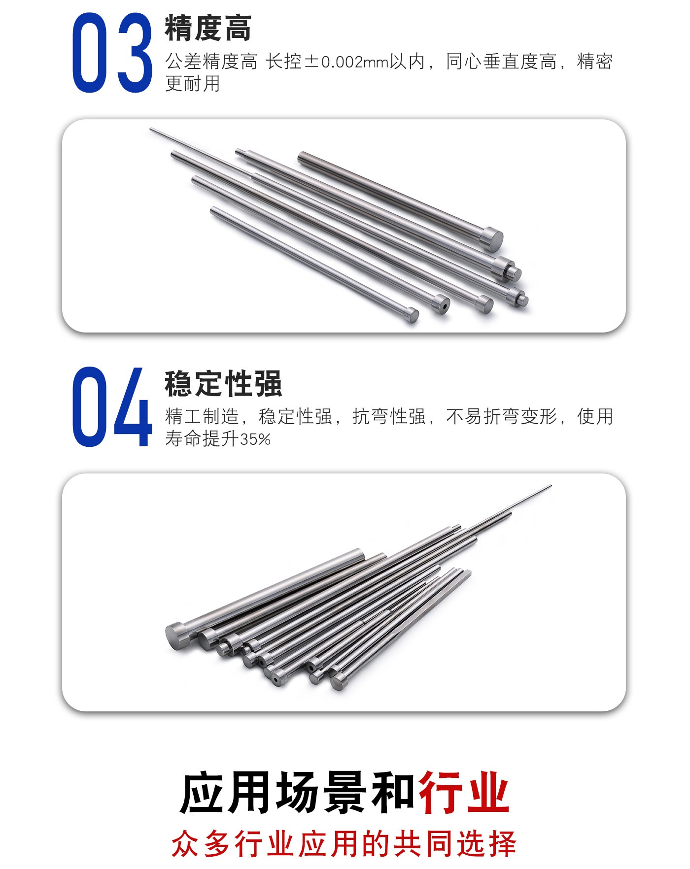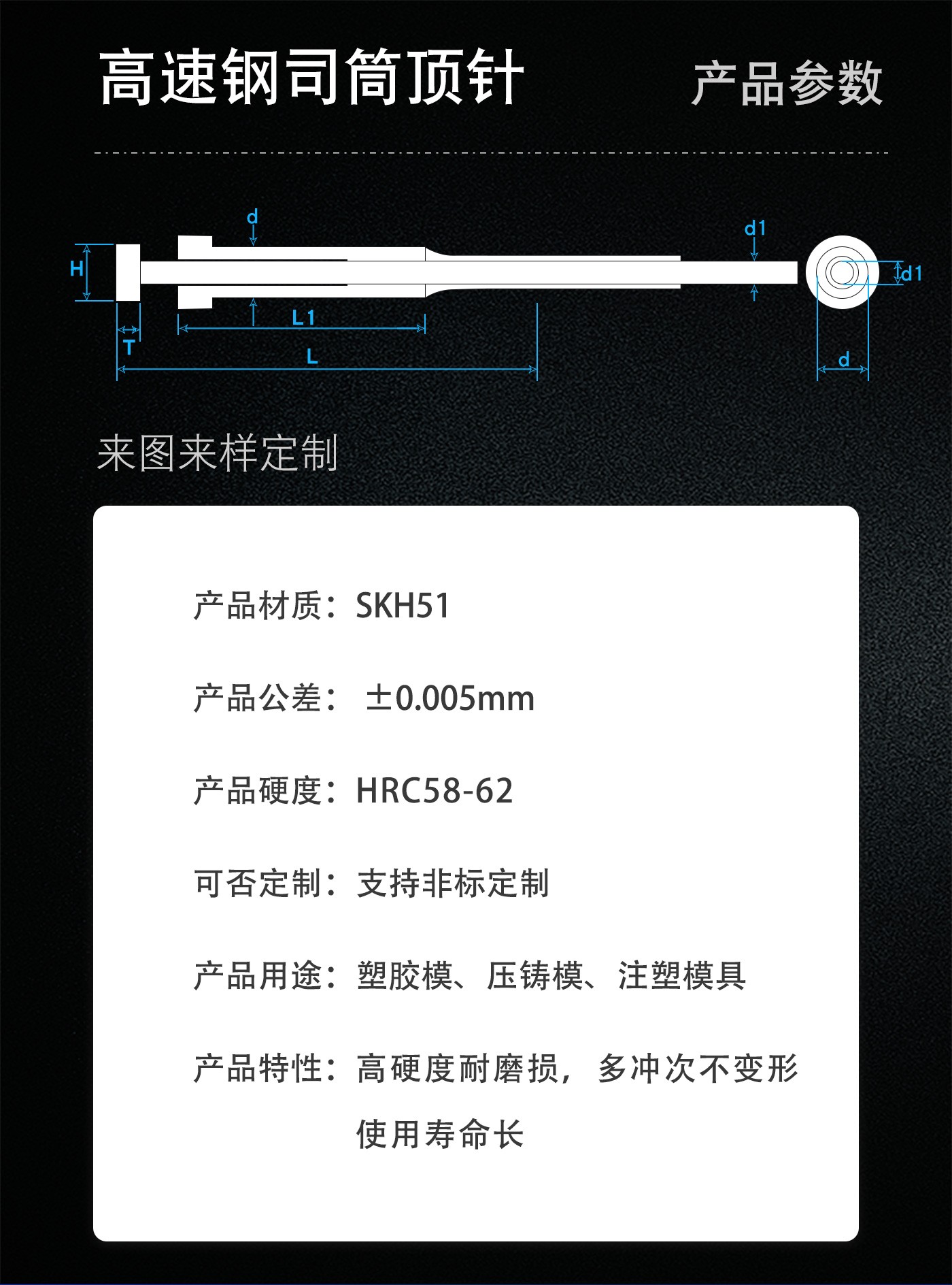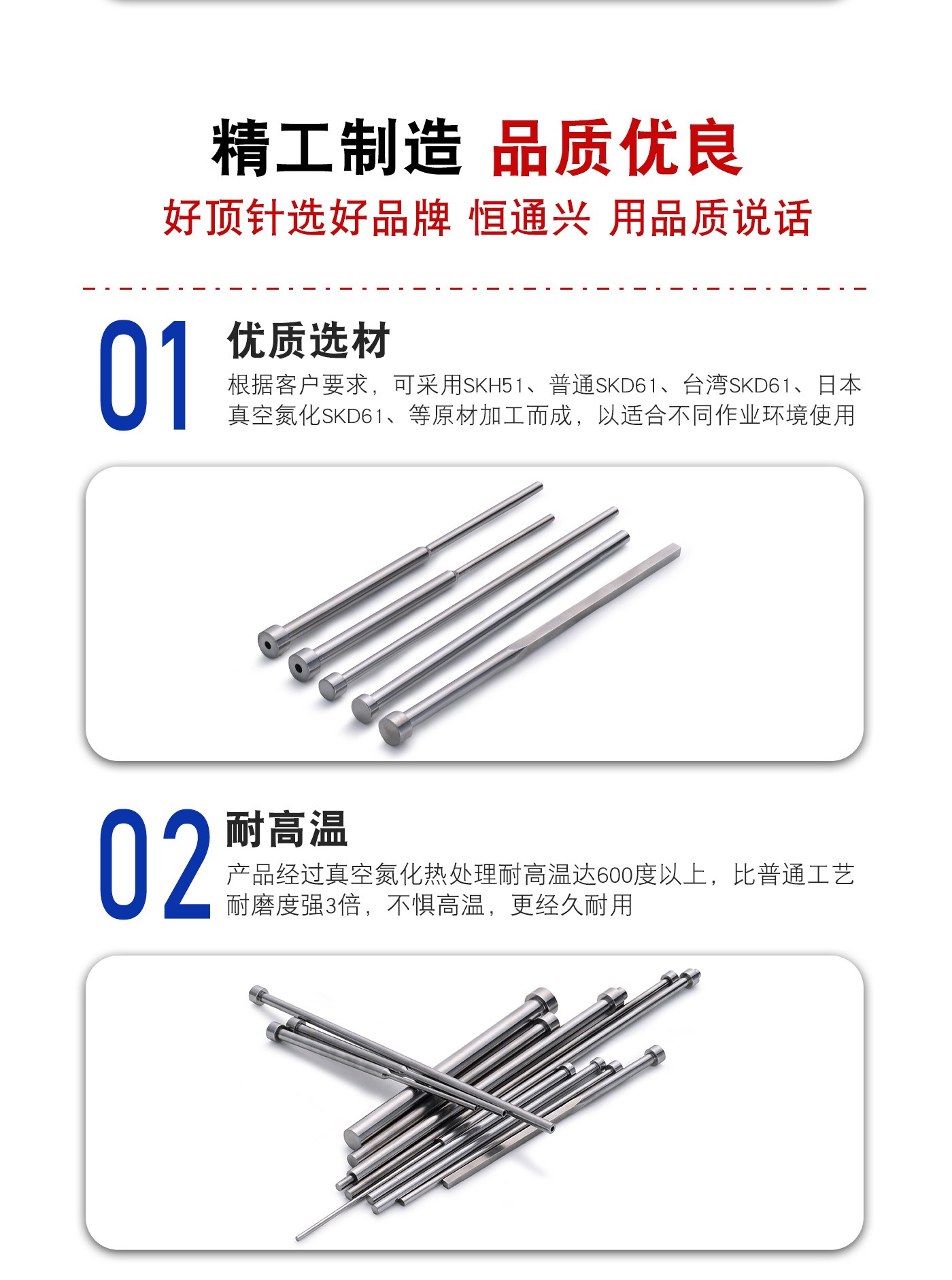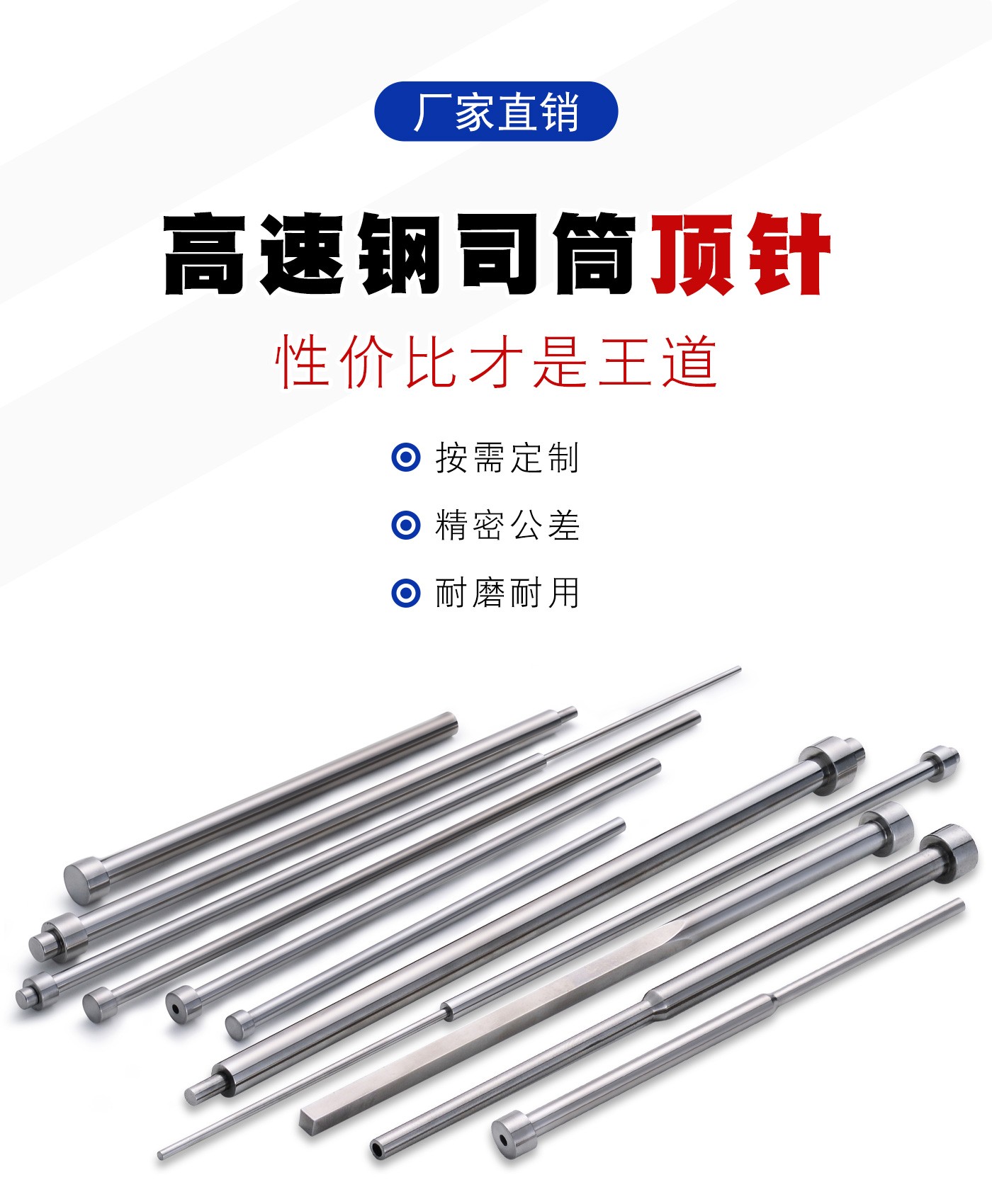 恒通興專業加工高速鋼司筒頂針,21年塑膠模具配件頂針加工經驗,優質選材,公差精密,產品耐高溫同心度高經久耐用,標準規格型號齊全,現貨10萬庫存,非標來圖來樣加工定制。