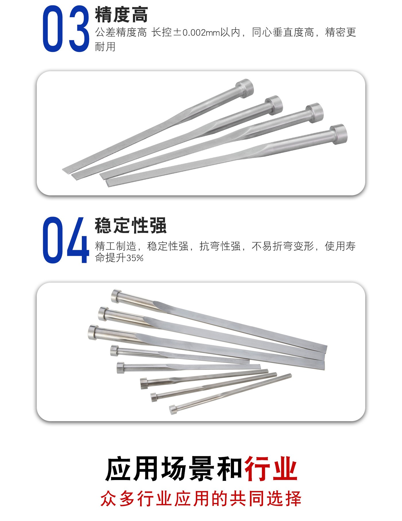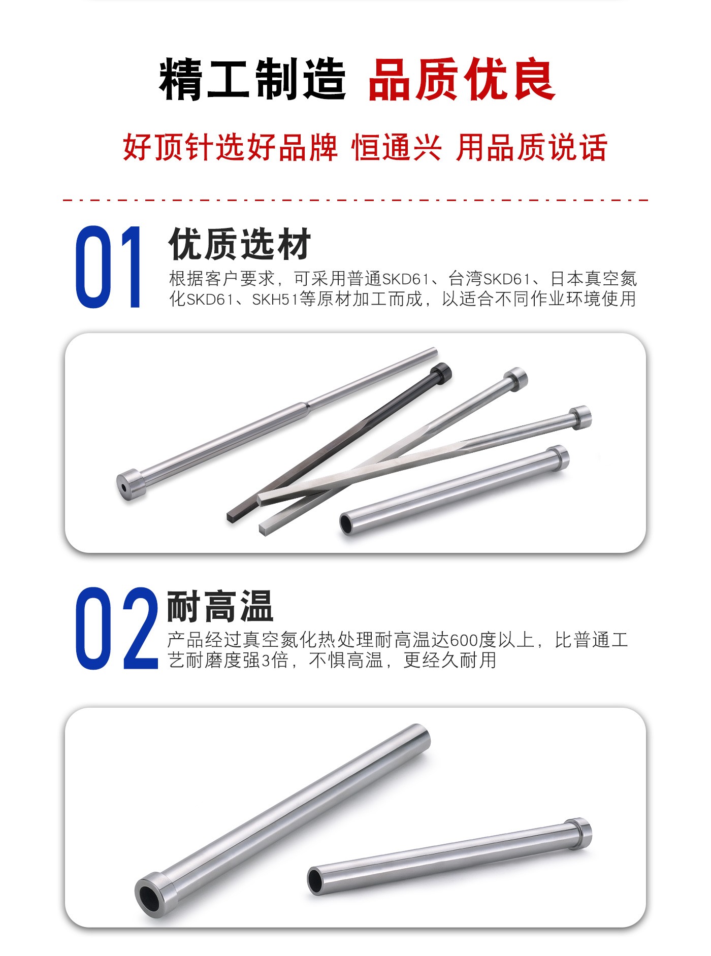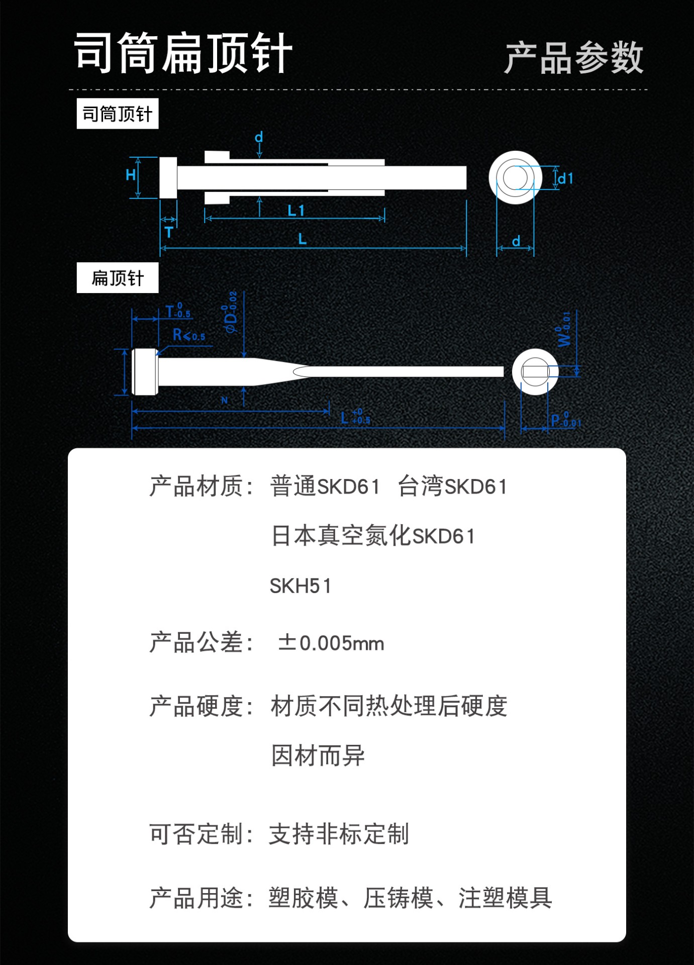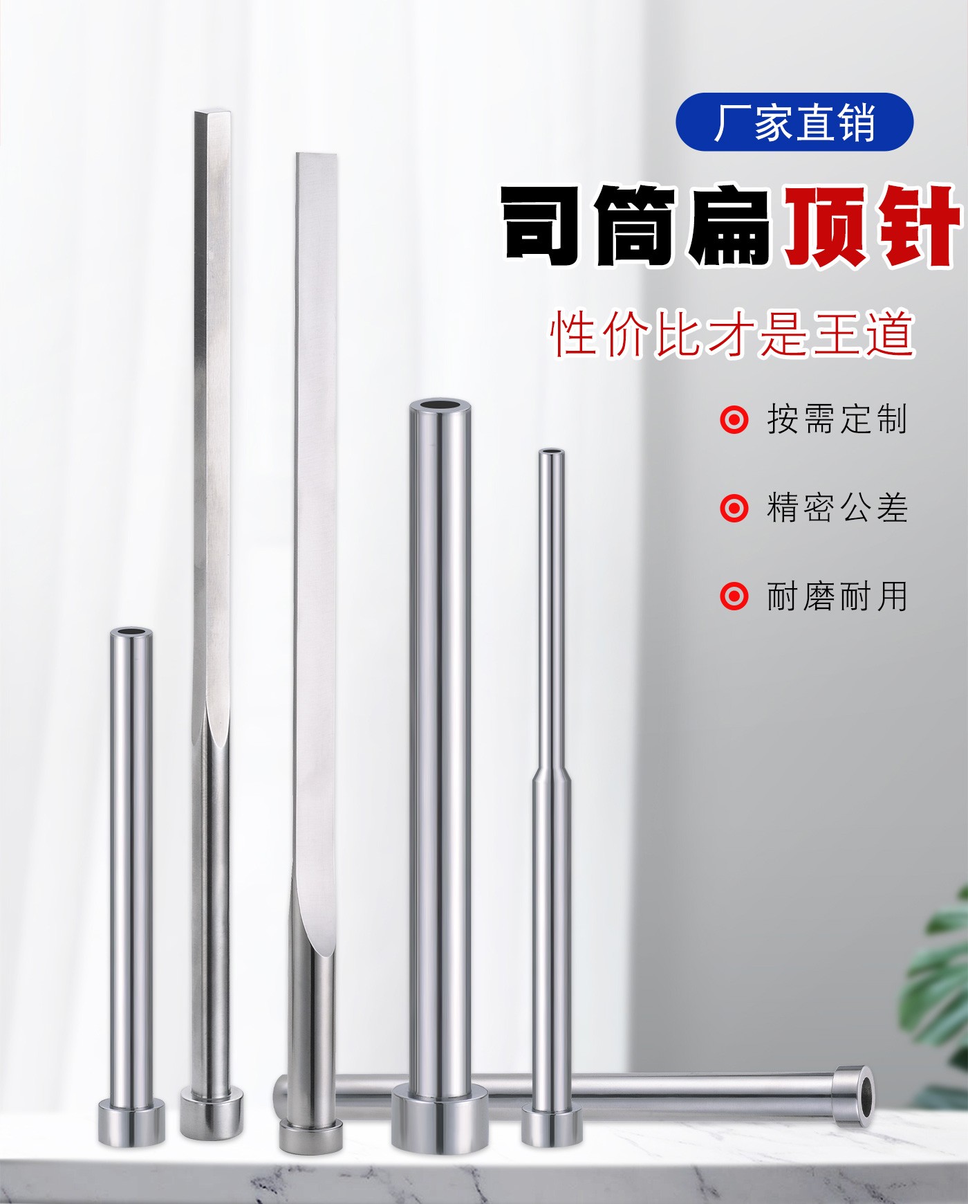 恒通興專業加工司筒扁頂針,21年塑膠模具配件頂針加工經驗,優質選材,真空氮化處理,硬度高,產品耐高溫600度,公差精密,同心度高經久耐用,標準規格型號齊全,現貨10萬庫存,非標來圖來樣加工定制。