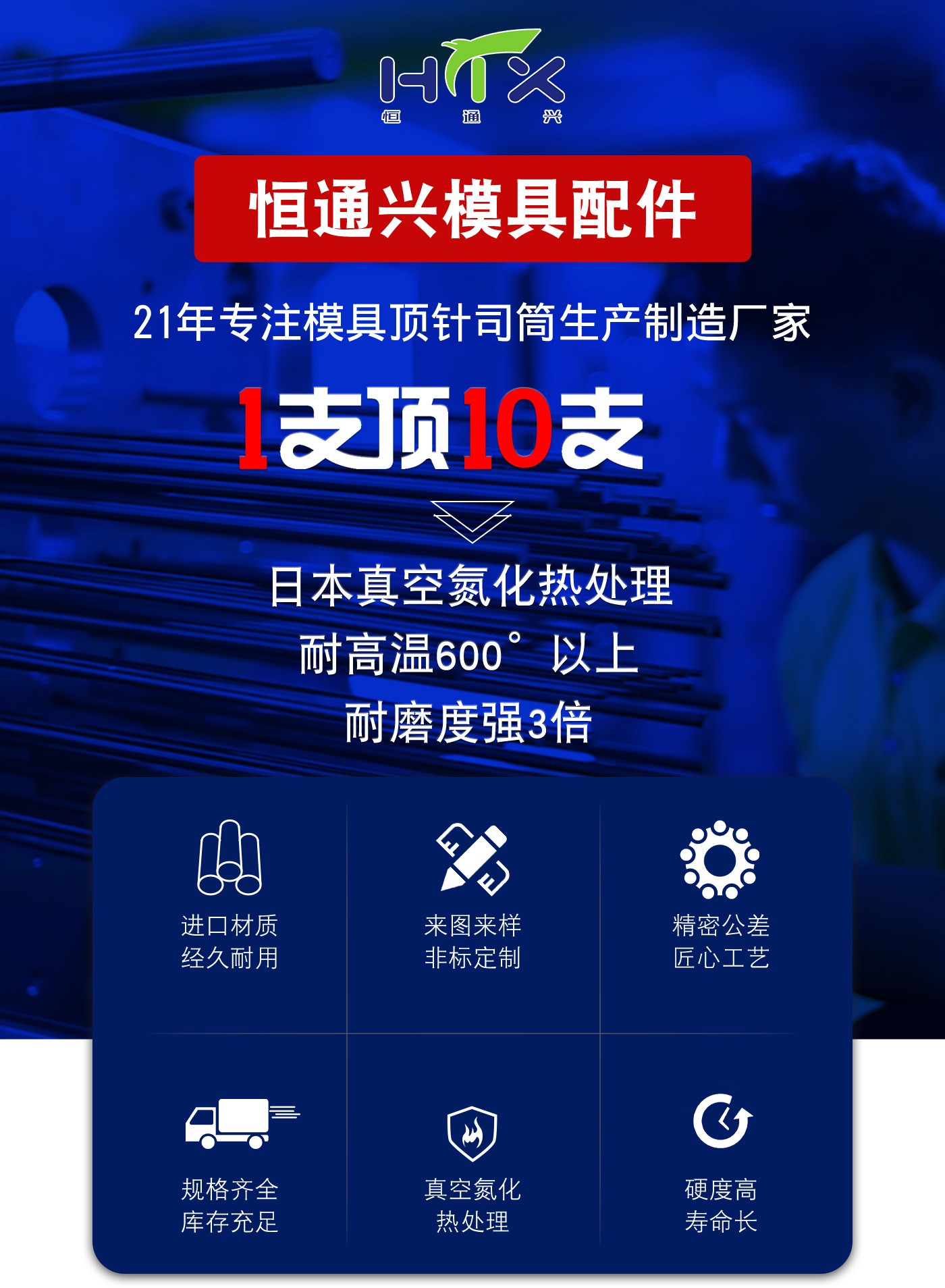 恒通興專業加工塑料模具頂針,21年塑膠模具配件頂針加工經驗,優質選材,真空氮化處理,硬度高,產品耐高溫600度,公差精密,同心度高經久耐用,標準規格型號齊全,現貨10萬庫存,非標來圖來樣加工定制。