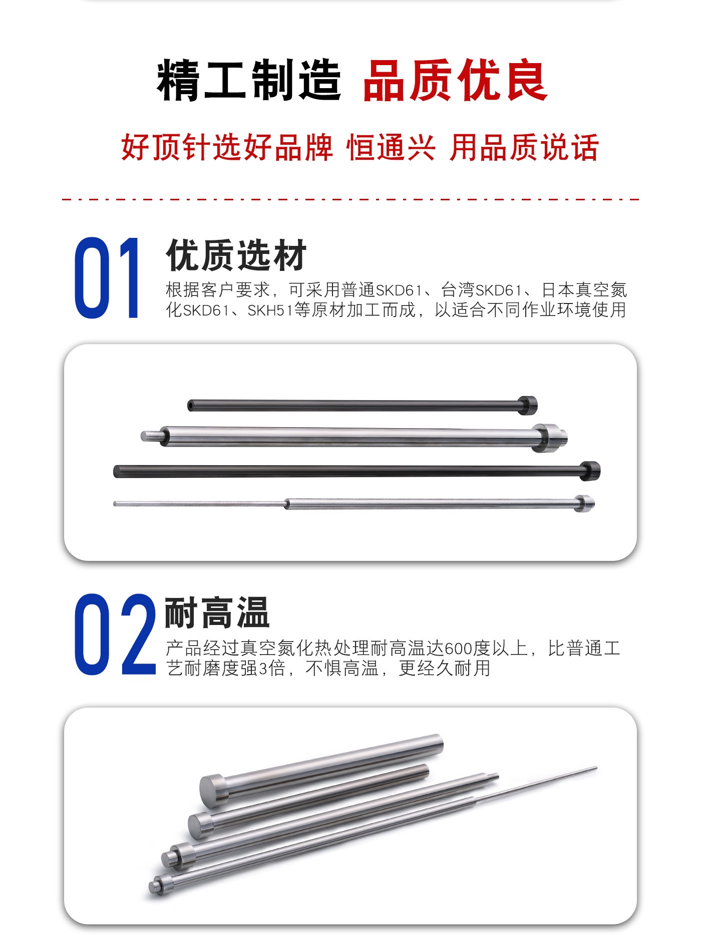 恒通興專業加工套管頂針,21年塑膠模具配件頂針加工經驗,優質選材,真空氮化處理,硬度高,產品耐高溫600度,公差精密,同心度高經久耐用,標準規格型號齊全,現貨10萬庫存,非標來圖來樣加工定制。