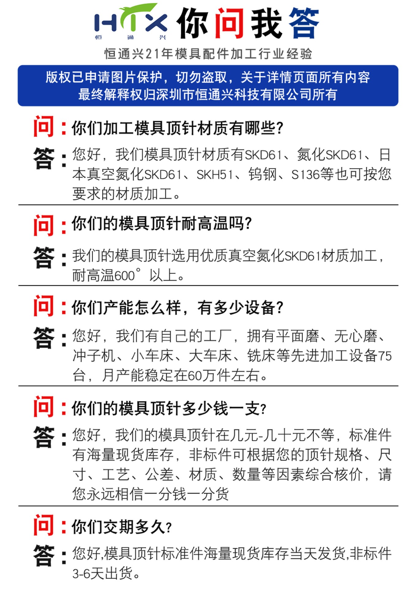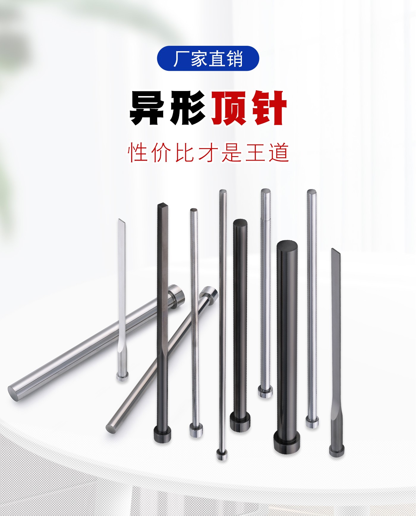 恒通興專業加工異形頂針,21年塑膠模具配件頂針加工經驗,優質選材,真空氮化處理,硬度高,產品耐高溫600度,公差精密,同心度高經久耐用,標準規格型號齊全,現貨10萬庫存,非標來圖來樣加工定制。
