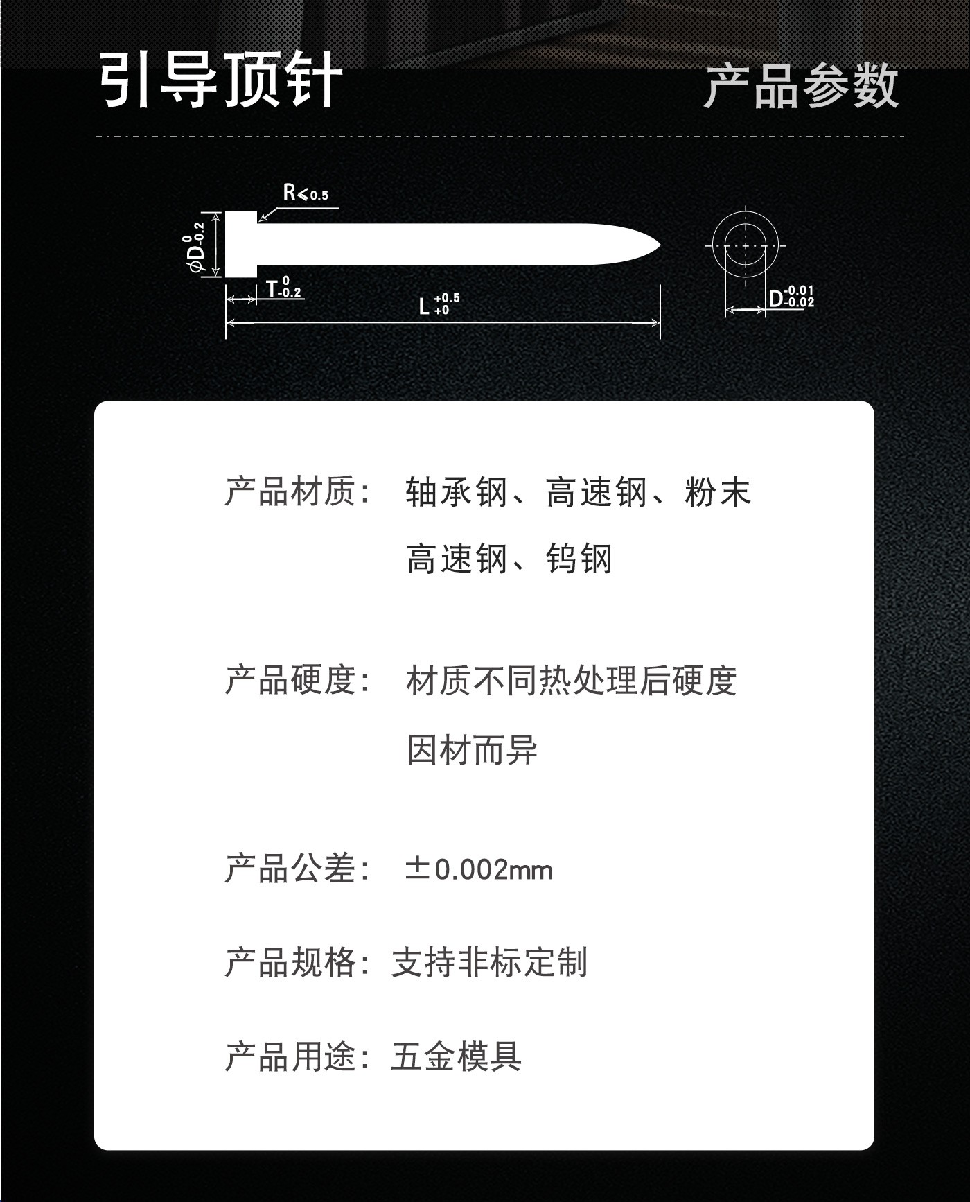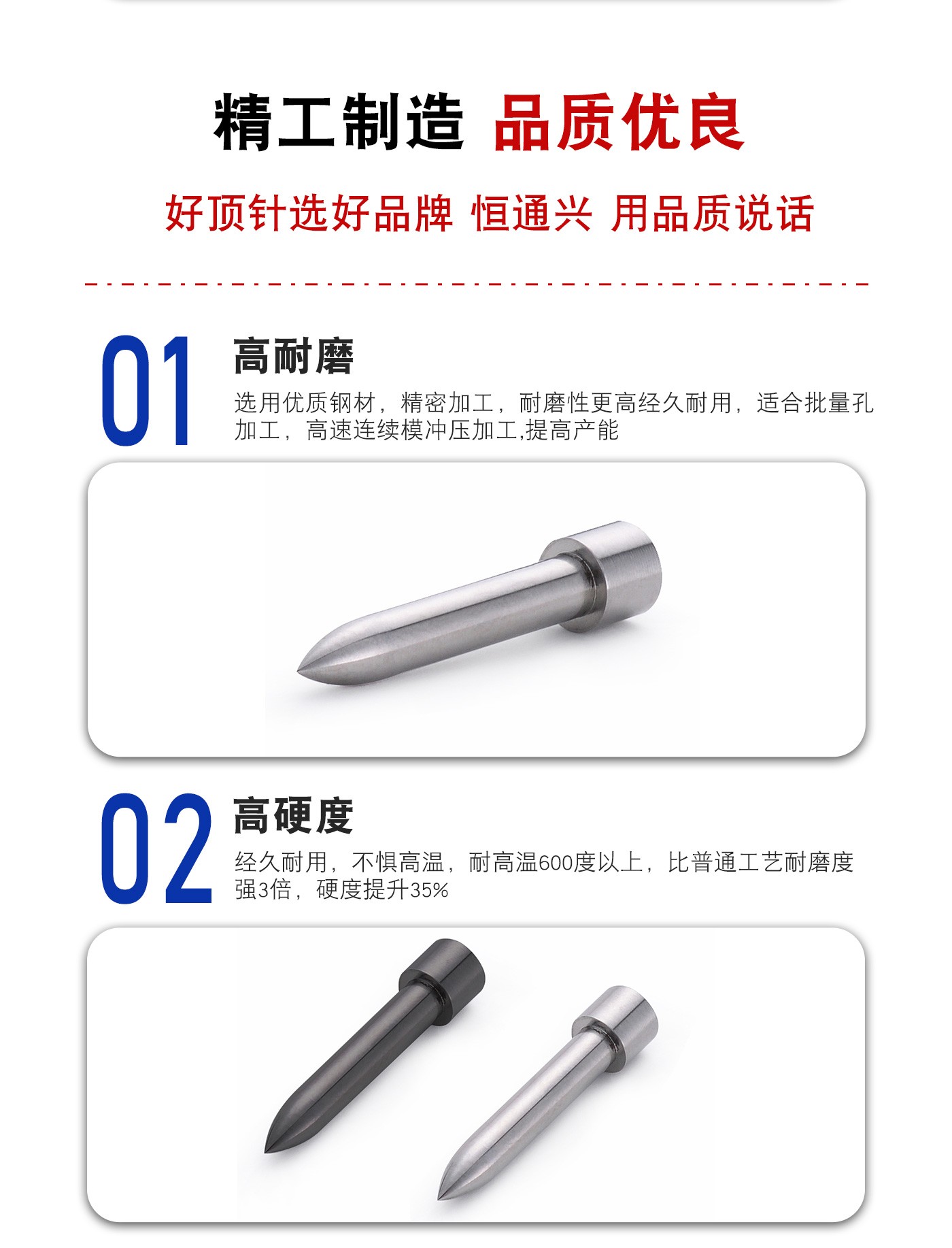 恒通興專業(yè)加工引導(dǎo)頂針,21年模具配件生產(chǎn)加工經(jīng)驗,優(yōu)質(zhì)選材,真空氮化處理,硬度高,產(chǎn)品耐高溫600度,公差精密,同心度高經(jīng)久耐用,標(biāo)準(zhǔn)規(guī)格型號齊全,現(xiàn)貨10萬庫存,非標(biāo)來圖來樣加工定制。