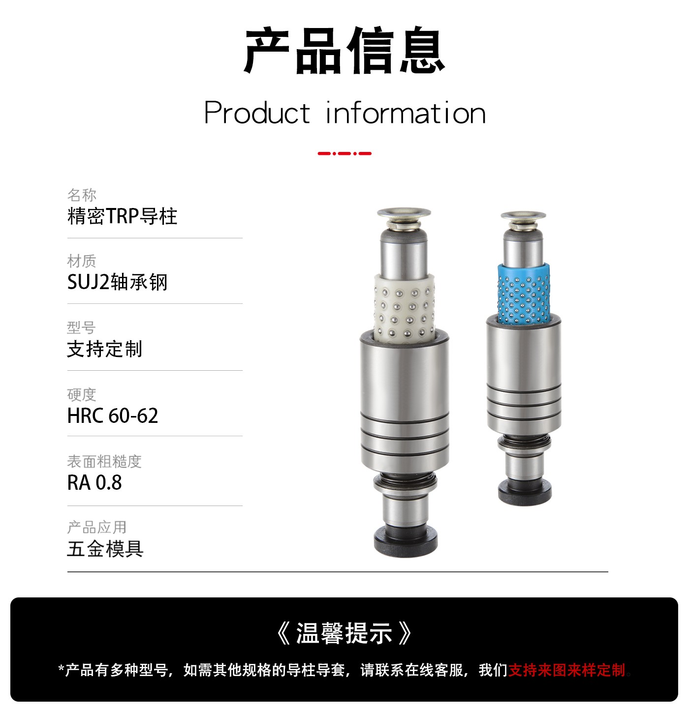 恒通興TRP滾珠導(dǎo)柱,材質(zhì)正宗,抗沖壓耐磨損,公差精度可達(dá)±0.005mm,標(biāo)準(zhǔn)規(guī)格型號(hào)齊全,10萬(wàn)現(xiàn)貨庫(kù)存,非標(biāo)可來(lái)圖定制。